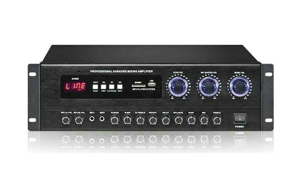 100W*2/8欧  频率响应 20Hz-20kHz 总谐波失真 0.05%  尺寸:430*330*130mm  装载USB/SD卡 蓝牙播放器并配套红外线遥控  三路麦克风输入 内置卡拉OK自动静噪电路 卡拉OK激励效果功能  开机